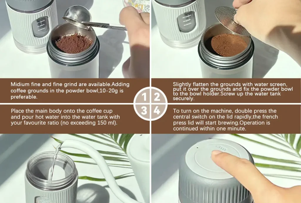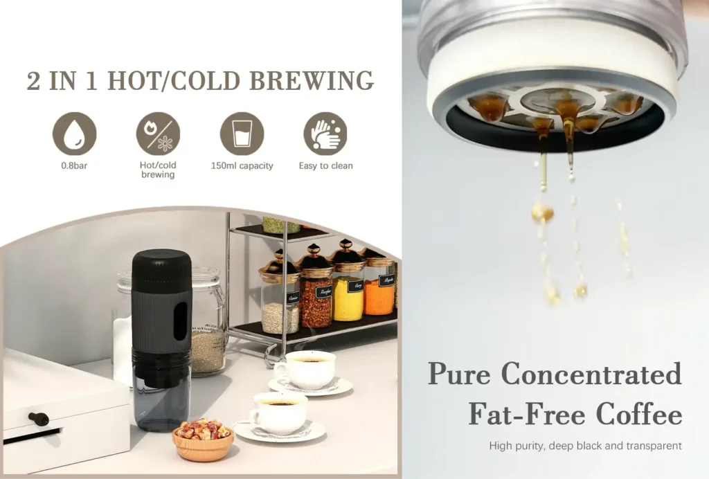 • *Compact & Practical* 150ml single-serve capacity (integrated water tank + cup), lightweight and portable—ideal for office/ travel/ outdoor use